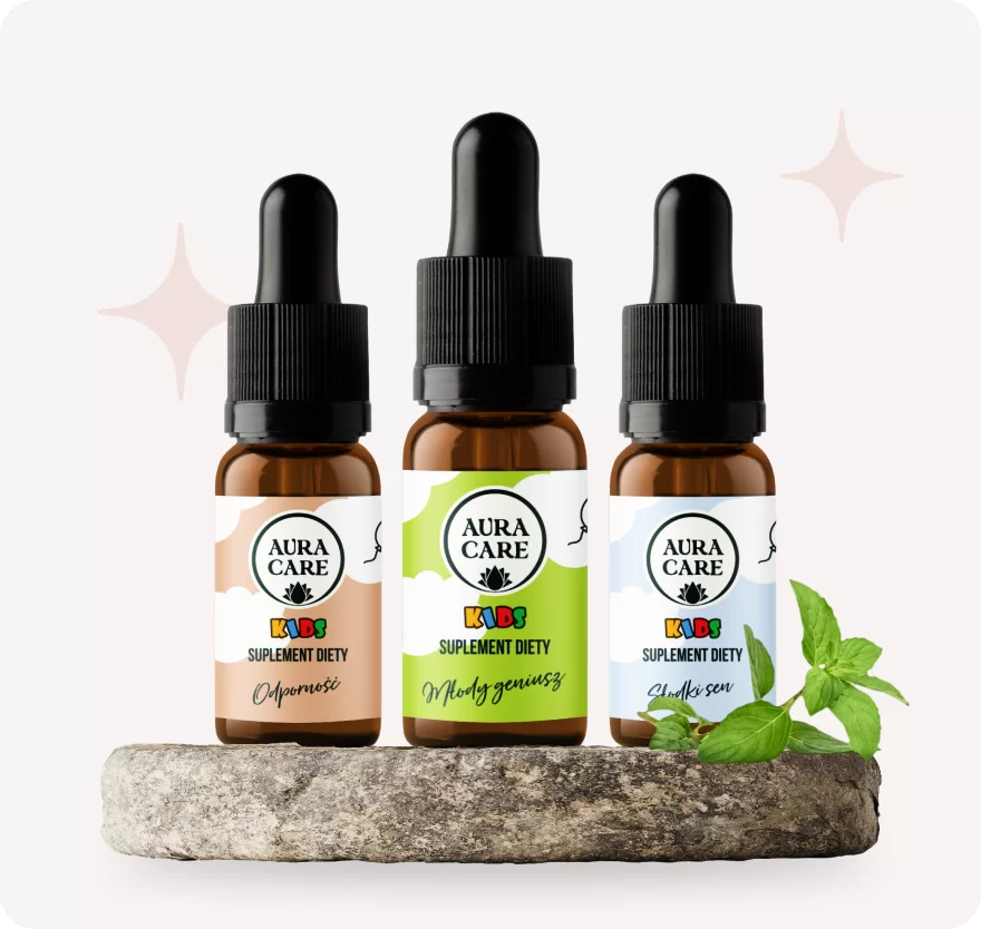 W adaptogenach Aura Care zdecydowaliśmy się na suplementy diety w formie olejku z dołączoną pipetą z zakraplaczem.